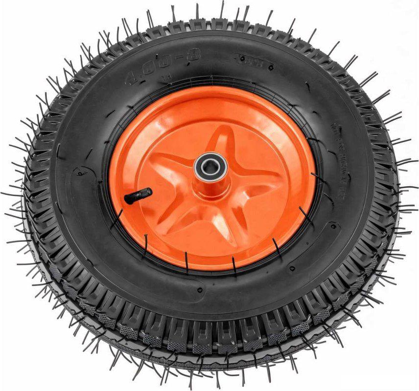 Пневматическое колесо 4.00-8 68953 диаметром 400 мм, с усиленной шиной 8PR, на подшипниках, с длиной оси 90 мм и посадочным диаметром 20 мм, устанавливается на тачки для перемещения грузов. Усиленная восьмислойная шина подходит как для садовых, так и для строительных тачек. Стальные шариковые подшипники обеспечивают плавный ход и возможность передвижения по неровной поверхности. | |