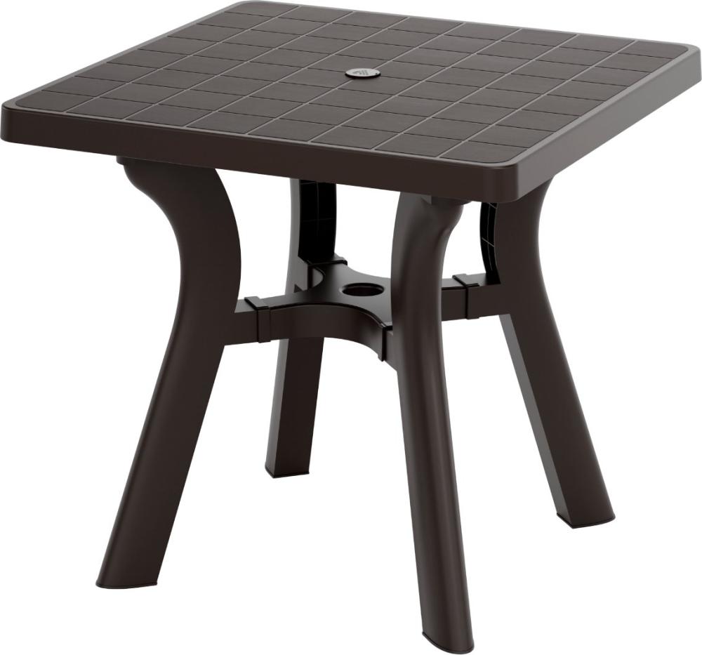 Стол квадратный «Атлант» имеет прочную конструкцию и устойчивый каркас, выдерживает воздействие внешних факторов, не теряя своего первоначального облика и качества. Изогнутые ножки соединены между собой крестовиной, что придает столу особую устойчивость. Ножки регулируются по высоте. Конструкция полностью разборная, что облегчает транспортировку и складирование. В центре столешницы имеется отверстие с заглушкой для установки зонта. Скругленные углы обеспечат более безопасное использование. Особенность данного стола в текстуре столешницы, которая имитирует дерево. | |