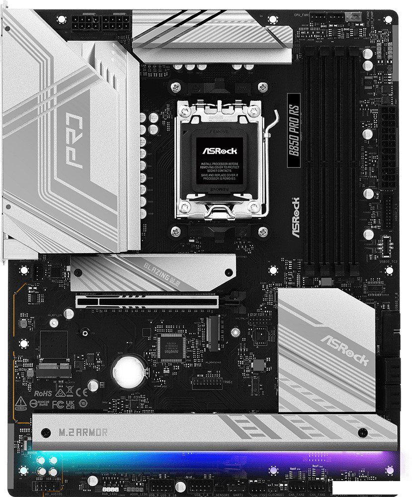 Описание ✅ ASRock B850 Pro RS - это современная материнская плата формата ATX, созданная для сборки производительных и игровых систем на базе процессоров AMD Ryzen серий 9000, 8000 и 7000. Она выполнена в стильном черном цвете с серебристыми деталями, оборудована массивными радиаторами для эффективного охлаждения и поддерживает яркую RGB/ARGB подсветку, позволяя реализовать индивидуальные световые эффекты. | |