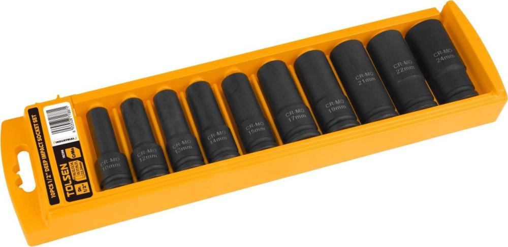 | Комплектация | Головки торцевые ударные глубокие 6-гранные 1/2" 10, 12, 13, 14, 15, 17, 19, 21, 22, 24 мм; Пластиковый держатель |