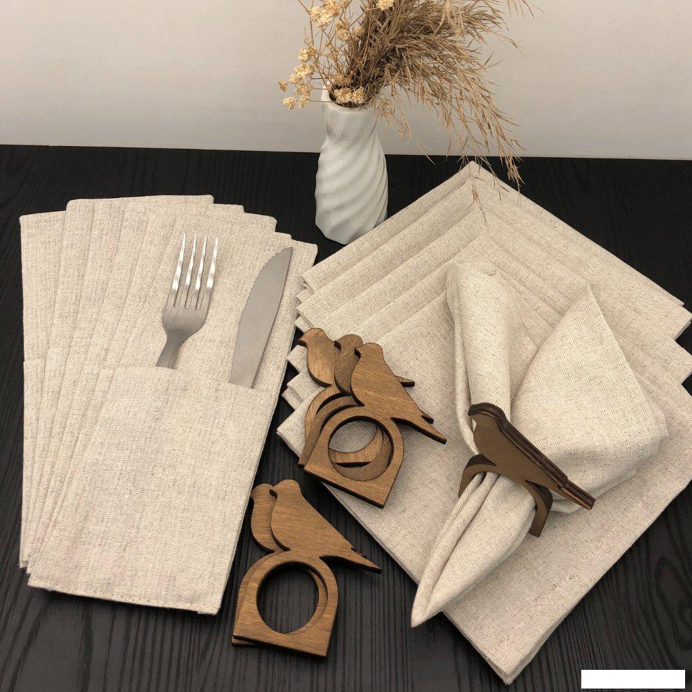 Описание ✅ Уникальный набор на 6 персон из тканевых салфеток с кольцами в форме птички и конвертов для столовых приборов станет идеальным решением для сервировки вашего стола. В комплект входят 6 квадратных текстильных салфеток (30×30 см), 6 деревянных держателей и 6 льняных конвертов (21×9 см) с двумя отделениями. Этот набор добавит особый шарм вашим обеденным посиделкам и украсит любой интерьер. | |