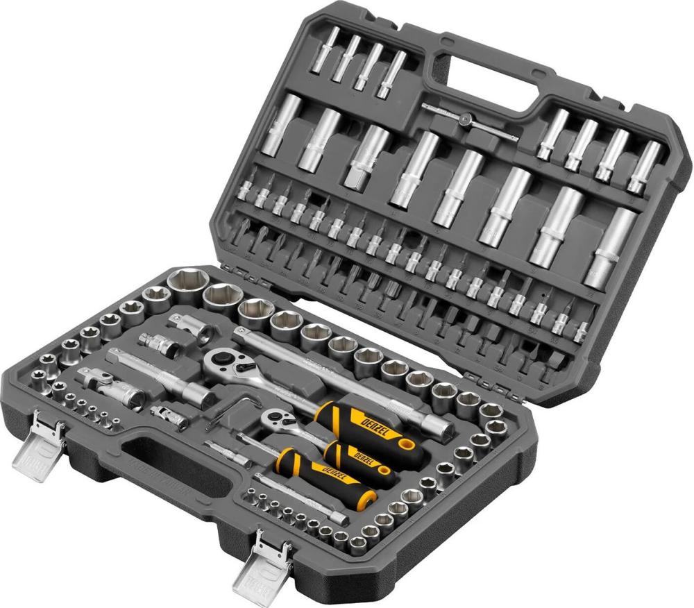 | Комплектация | Ключ-трещотка 1/2", 1/4" 2 шт Вороток Т-образный 1/4": 115 мм 1 шт Кардан: 1/4", 1/2" 2 шт Переходник для бит 1/2"-5/16" 1 шт Удлинители 1/4": 50, 100 мм 2 шт Удлинители 1/2": 125, 250 мм 2 шт Присоединительный квадрат воротка 1/2" 1 шт Отвертка-держатель 2К-рукоятка 1/4": 150 мм 1 шт Ключи имбусовые 3 шт Головки свечные магнитные 3 шт Головки торцевые 1/4" 13 шт Головки торцевые 1/2" 17 шт Головки торцевые удлиненные 1/4" 7 шт Головки торцевые удлиненные 1/2" 5 шт Головки торцевые 1/4" 5 шт Головки торцевые 1/2" 8 шт Биты-вставки 5/16", 30 мм 17 шт Биты с головками 1/4" 18 шт Пластиковый кейс 1 шт |