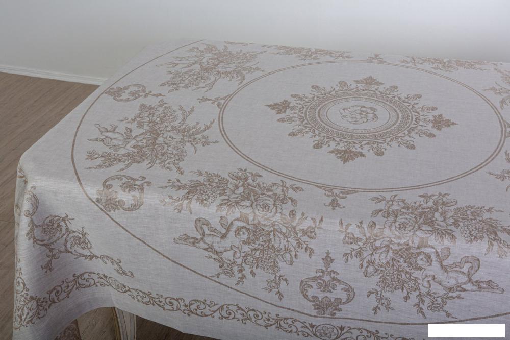 Прямоугольная скатерть из 100% льна с жаккардовым узором и плотностью ткани 210 г/м². Размеры 170x245 см обеспечивают удобство использования на больших столах. Цветовая гамма включает бежевый и серый оттенки с декоративным рисунком, что придаёт изделию стильный и универсальный вид.
