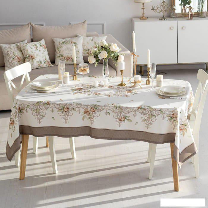 Прямоугольная скатерть из 100% хлопка с плотностью ткани 190 г/м² предназначена для защиты и украшения столов. Изделие имеет размеры 225 на 145 см и выполнено с использованием цифровой печати, что обеспечивает яркий и стойкий рисунок на лицевой стороне. Цветовая гамма включает бежевые и белые оттенки с растительным орнаментом.