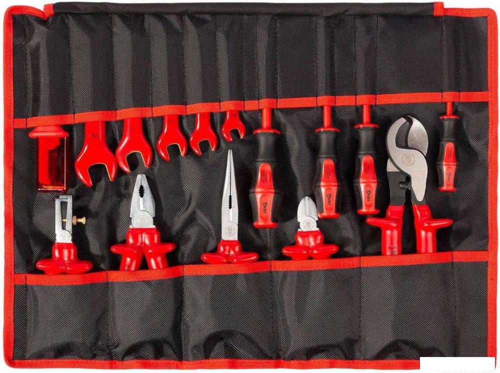 | Комплектация | диэлектрические пассатижи 180 мм диэлектрические бокорезы усиленные 160 мм диэлектрические длинногубцы 200 мм диэлектрический стриппер 160 мм диэлектрическая отвертка: шлиц 3.0х100 диэлектрическая отвертка: шлиц 5.5х125 диэлектрическая отвертка: PH1x80 диэлектрическая отвертка: PH2x100 диэлектрический однорожковый ключ 10 мм диэлектрический однорожковый ключ 12 мм диэлектрический однорожковый ключ 13 мм диэлектрический однорожковый ключ 17 мм диэлектрический однорожковый ключ 19 мм диэлектрический нож монтерский НМИ-11 диэлектрический ножницы НКи-16 серия ЭКСПЕРТ |