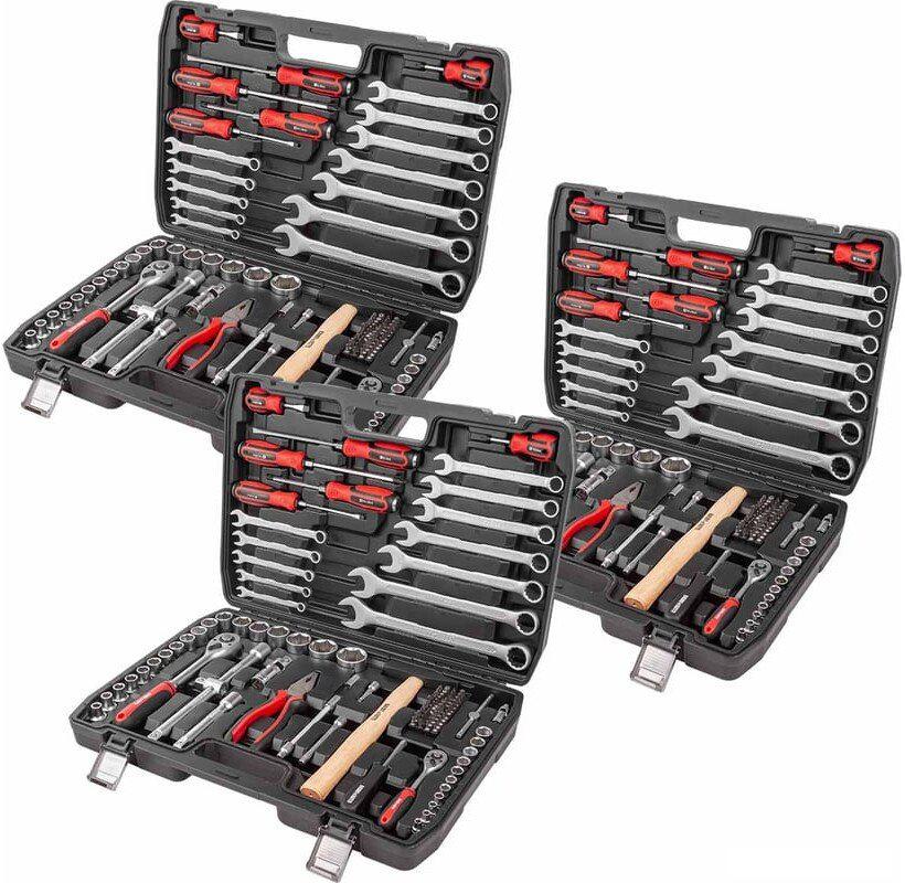 | Комплектация | 3 комплекта из 106 предметов: торцевые головки 1/4" (5, 5.5, 6, 7, 8. 9, 10, 11, 12, 13, 14 мм.), головки 1/2" (8, 9, 10. 11, 12, 13, 14, 15, 16, 17, 18, 19, 21, 22, 24, 27, 30, 32 мм.), биты 44 шт., ключи комбинированные (8, 9, 10, 11, 12, 13, 14, 15, 17, 19, 22, 24 мм.), кардан 1/2" , кардан 1/4", Т-образный вороток 1/4", удлинители 1/4" 50 и 100 мм., удлинители 1/2" 125 и 250 мм., адаптер 3/8"(F)х1/2"(М), отвертки крестовые и шлицевые 6 шт., гибкий удлинитель, плоскогубцы 180 мм., молоток 290мм., рукоятка 1/4" 150 мм., трещотка 1/2" 250 мм., трещотка 1/4" 150 мм., кейс. |