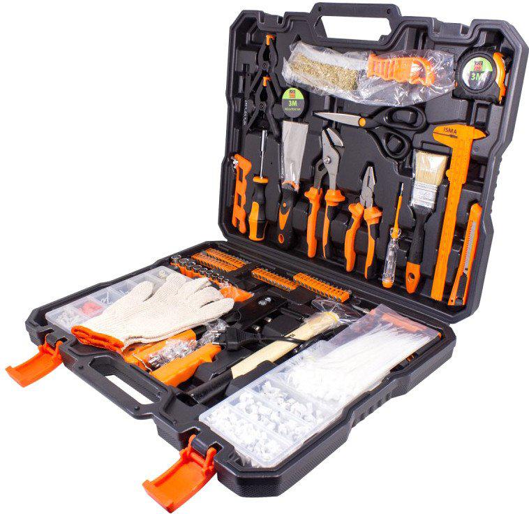 | Комплектация | комбинированные плоскогубцы, переставные пассатижи, зажимы для проводов, ножницы, уровень, рулетка, изолента, индикаторная отвертка, нож, штангенциркуль, шпатель, мини-пила, металлическая щетка, клей-пистолет со стержнями, перчатки, крепежные изделия, кейс |