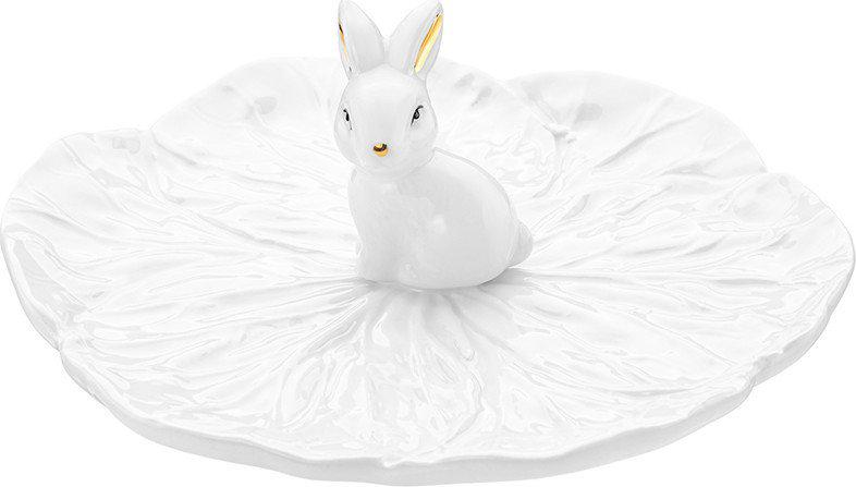 Блюдо украшено рельефным рисунком, имитирующим листья капусты, что добавляет текстуру и оригинальность изделию. Фигурка зайчика с золотыми ушками привлекает внимание и создаёт атмосферу уюта и тепла. Изделие поставляется в стильной картонной упаковке, что делает его отличным подарком на Пасху и другие праздники.