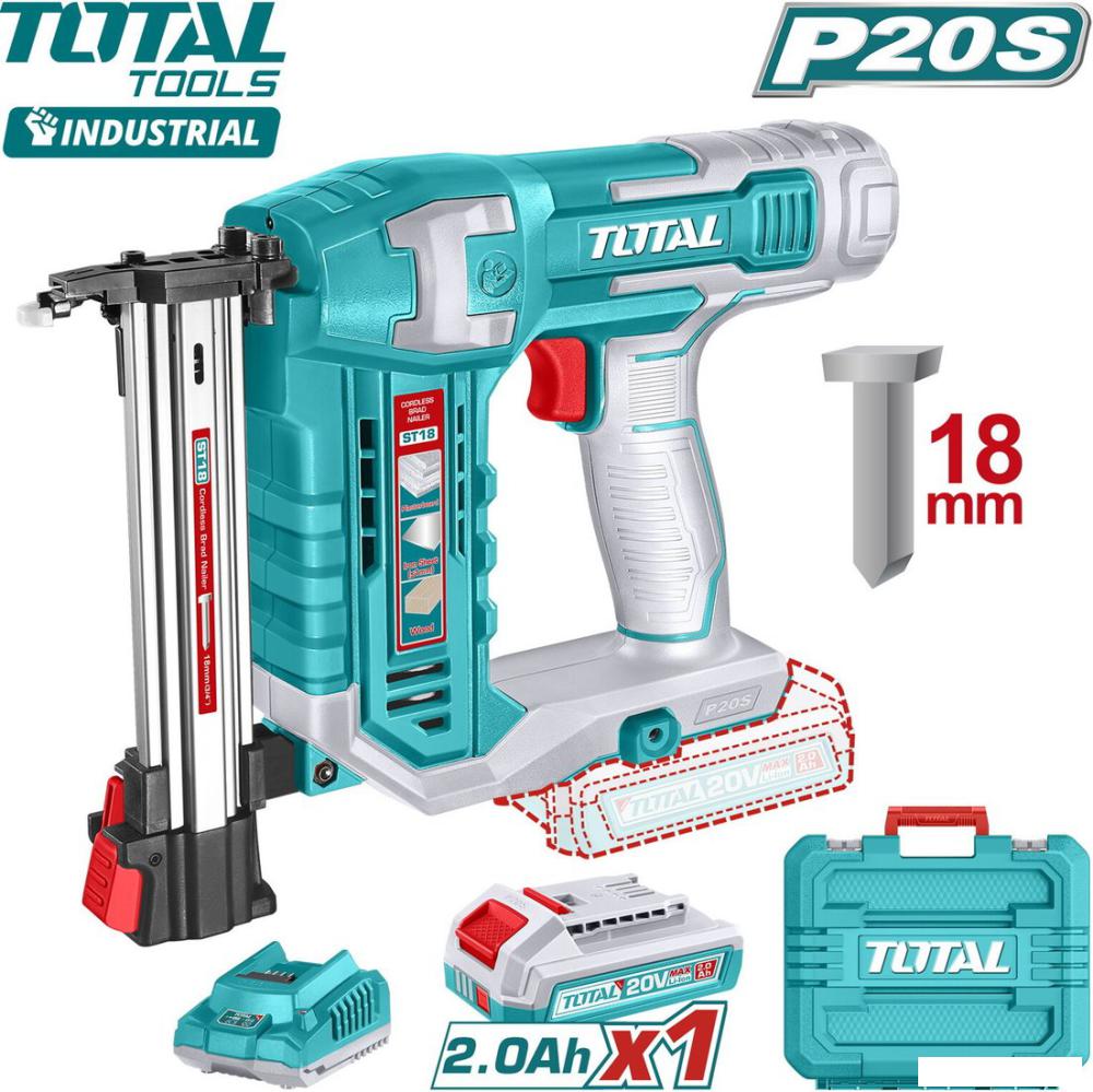 | Комплектация | - Аккумуляторный гвоздезабиватель 20 В – 1 шт. - Аккумулятор TFBLI2001 2.0 Ач – 1 шт. - Зарядное устройство TFCLI2001E – 1 шт. - Гвозди 18 мм – 200 шт. - Воздушная насадка – 1 шт. - Штифт (пин) – 1 шт. - Пластиковый кейс – 1 шт. |