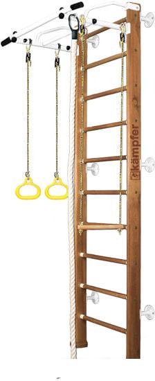 Детский спортивный комплекс для дома представляет собой шведскую стенку, которая крепится к стене или враспор между стеной и потолком, и набор дополнительного гимнастического оборудования, который устанавливается на стенку или дополнительные опоры/повесы. |