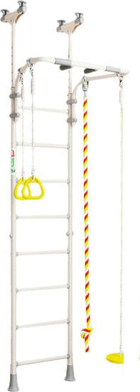 Детский спортивный комплекс для дома представляет собой шведскую стенку, которая крепится к стене или враспор между стеной и потолком, и набор дополнительного гимнастического оборудования, который устанавливается на стенку или дополнительные опоры/повесы. |