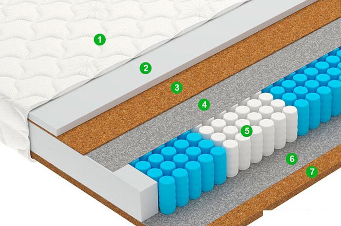 Количество зон жёсткости Как правило, в ортопедических матрасах пружинный блок имеет несколько зон, в которых различается упругость и жёсткость пружин. Это необходимо для достижения одинаковой поддержки различных частей тела - головы, шеи, плечевого пояса, талии, бедер, голеней, стоп. |
