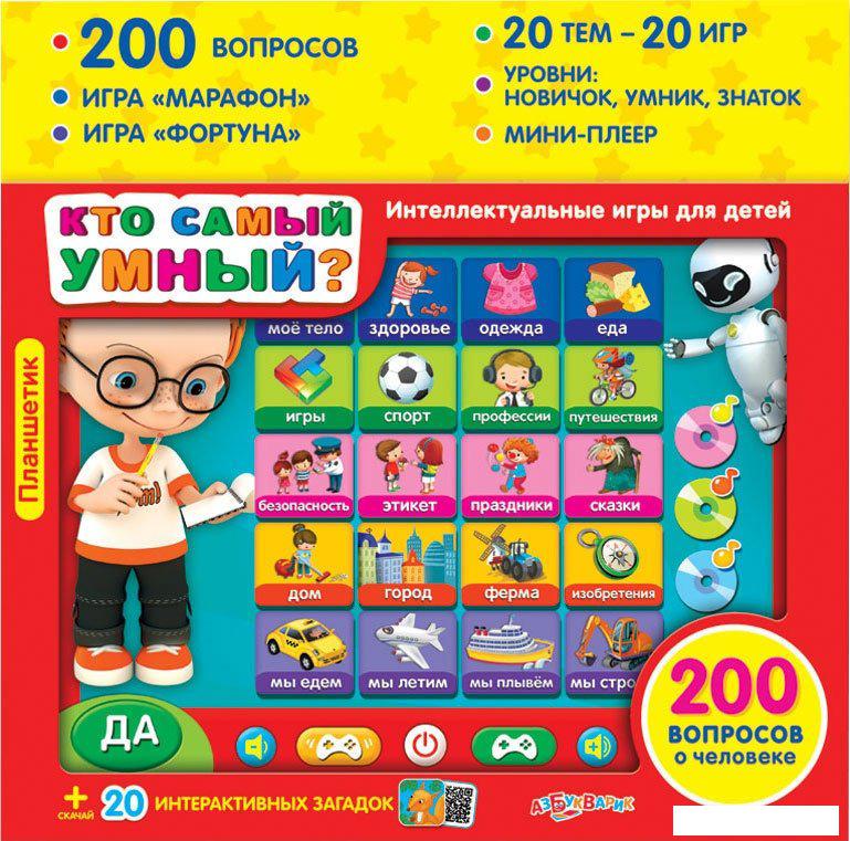Описание Краткая информация об отличиях товара от конкурентных моделей и аналогов, сведения о позиционировании на рынке, преемственности и др. Этот говорящий планшетик – прекрасный подарок для маленьких эрудитов! 200 умных вопросов, 20 игровых тем, 3 уровня – играй и узнавай много интересного! Выбирай одну из увлекательных викторин – «Марафон» или «Фортуна». Отвечай на вопросы с весёлым Максом и становись Суперзнатоком! |