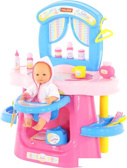 На стойке расположен столик для кормления, емкость для купания пупса. Также вы найдете ночной горшок, соску, бутылочку для кормеления, флакон для присыпки, баночку для шампуня, вешалки, блюдце, чашку, ложку, нож, вилку. |