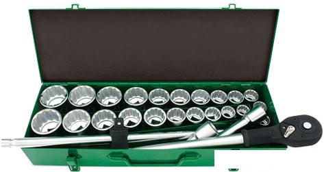- 22 торцевых 12-гранных головок: 22, 24, 27, 30, 32, 36, 38, 41, 46, 50 мм. 7/8,5/16, 1, 1-1/8, 1-3/16, 1-5/16, 1-3/8, 1-7/16, 1-5/8, 1-3/4,1-7/8,2 дюйма - 2 удлинителя размером на 100 и 200мм, - вороток с плавающей головкой размером 510мм - трещотка на 24 зубца. |